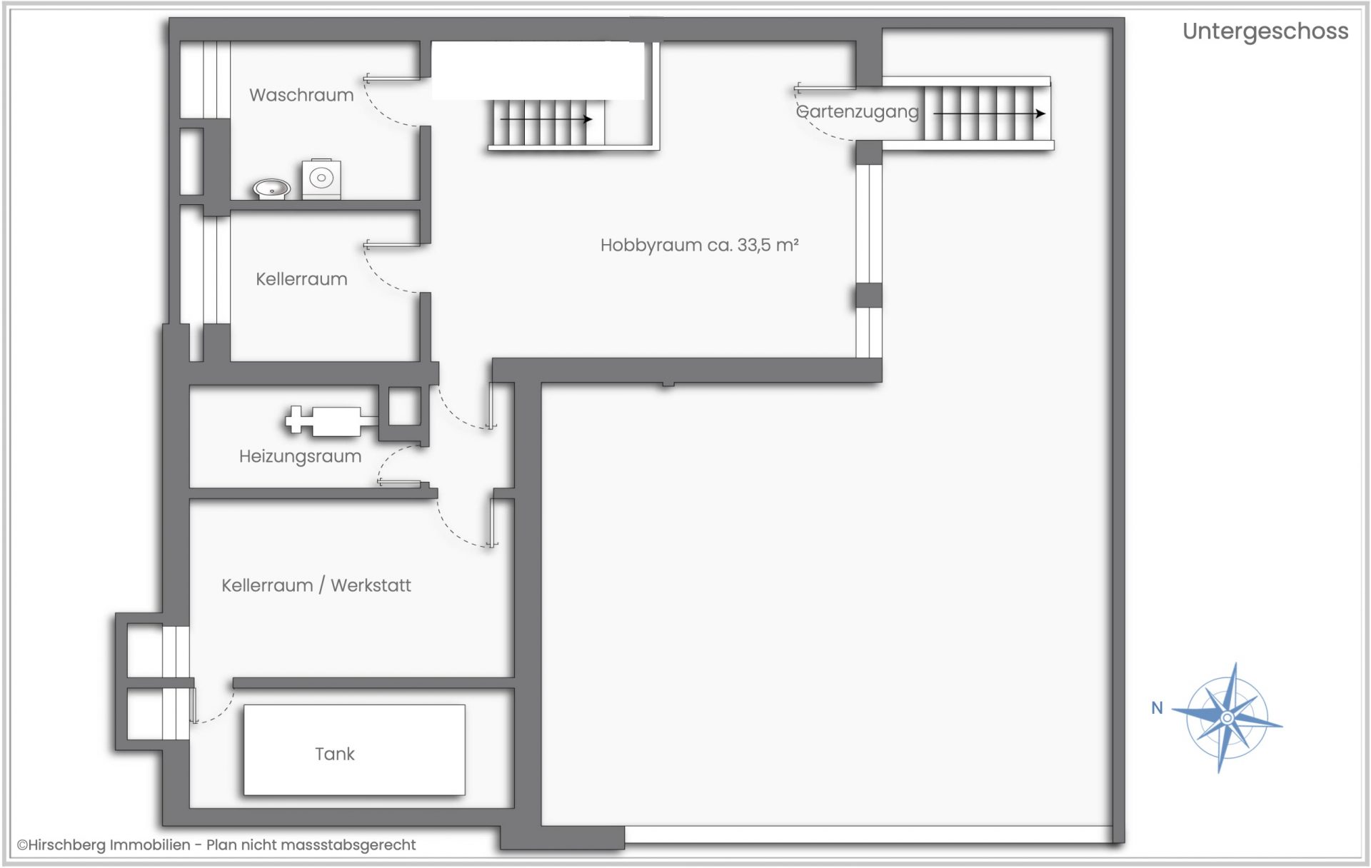 Der großzügige Hobbyraum mit über ca. 33 Quadratmetern, zwei großen Fenstern, Heizung, einer Raumhöhe von ca. 2,50 m inklusive separatem Zugang in den Garten ist eine fantastische Ergänzung im Haus und erlaubt viele verschiedene Nutzungsmöglichkeiten.