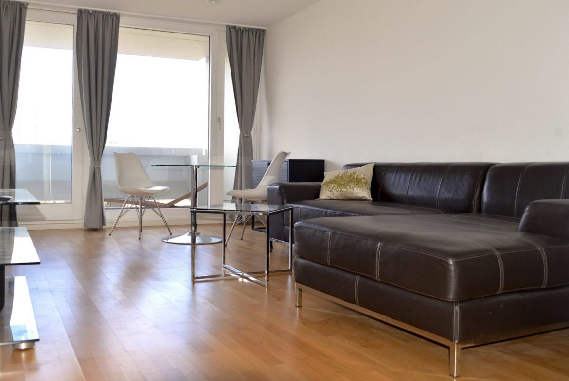 Vom Wohnzimmer gelangt man auf die großzügige, sonnige Westloggia mit herrlichem Blick über das Olympiadorf und in den angrenzenden Park. Hier stehen Tisch, zwei Klappstühle und eine Liege zur Erholung bereit.